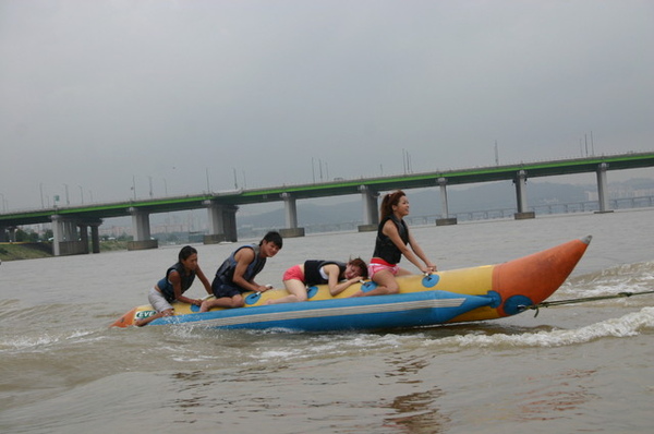 但沒想到當香蕉船一出發,小白就遠遠的看到一個可憐的孩子,緊緊抓著手把,驚嚇的貼在香蕉船上...