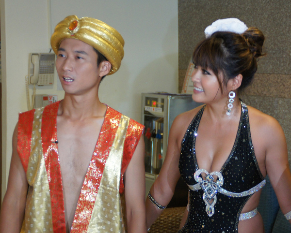 則是扮成國標舞男舞者,穿上超級深V的上衣,難得秀出「胸肌」!浩子則是搞笑扮成「阿拉丁」,頭戴旁人開玩笑「大便帽」,同樣也小露有胸毛的胸肌,為了避免露點,浩子搞笑用膠帶貼住,剛好貼成一個笑臉,JR迅雷不及眼耳的速度撕下膠帶,讓浩子大叫好痛!