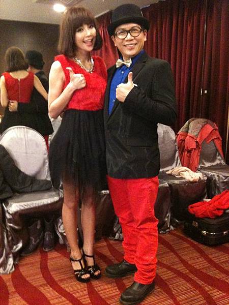 和董哥搭檔主持房仲業尾牙,欣怡特地穿上一身紅洋裝,增添喜氣